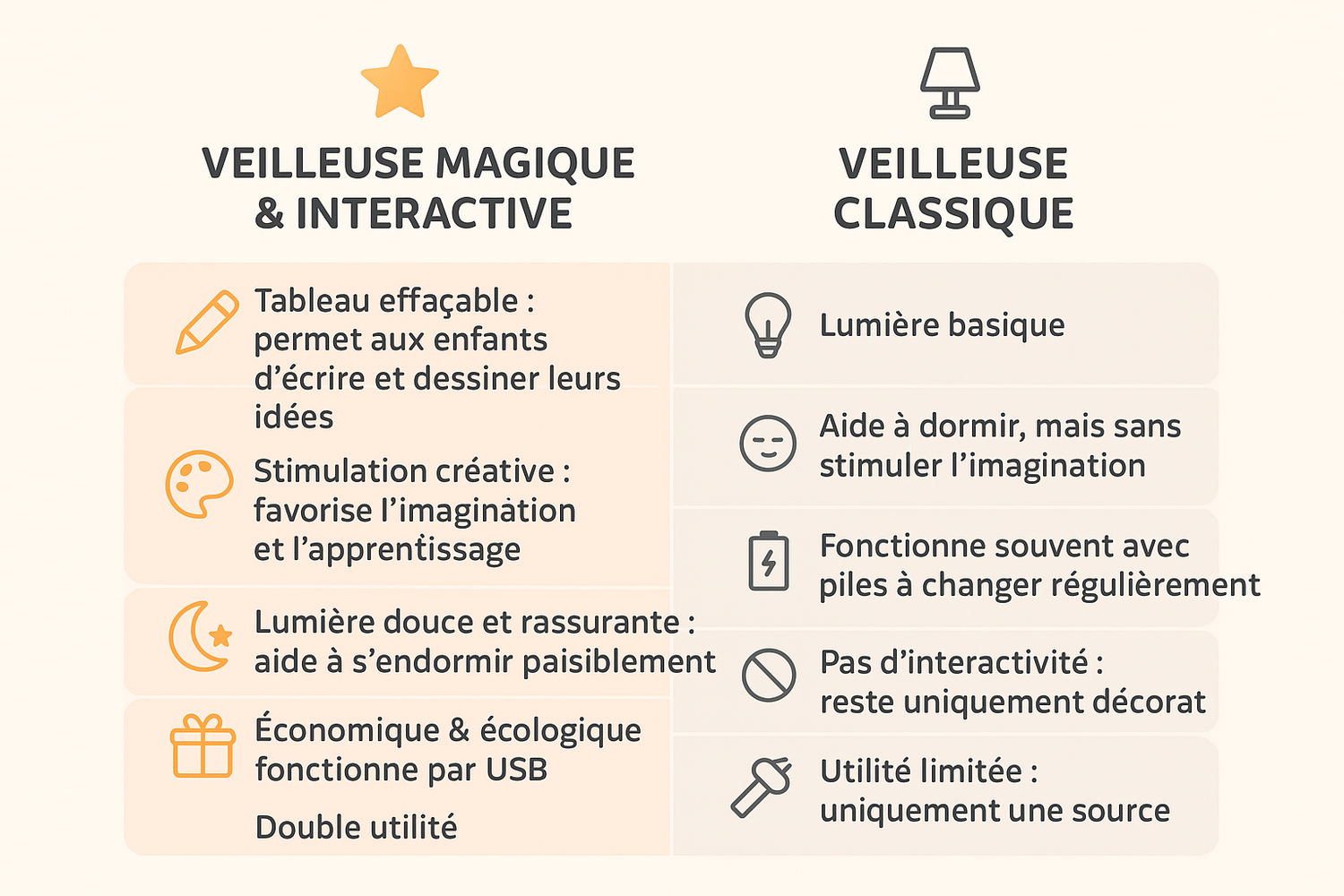 Cette veilleuse unique ne se contente pas d’éclairer : elle devient untableau interactif. Votre enfant peutdessiner, écrire ou inventer des histoiresdirectement dessus avec le stylo effaçable 🖊️. Chaque soir, sa chambre se transforme en espace de jeu et de créativité, stimulant son imagination tout en rendant la routine du coucher plus fun 🤩.